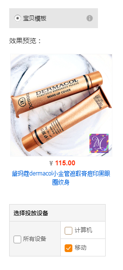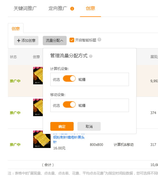 首先添加创意图,创意图默认只能从主图中选择,一个正常店铺想开通本地上传功能的条件是直通车月花费高于3000,并且推广天数大于20天。由于无线端流量远远大于pc端流量,所以投放创意图时建议勾选移动端设备。